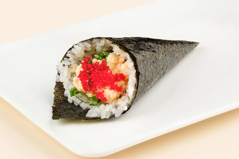 Рис, нори, креветка, спайси соус, икра тобика красная, лук зеленый