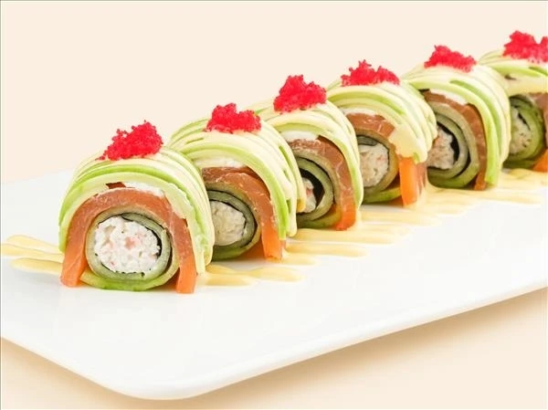 Нори, огурец, краб-микс, форель 40 гр, авокадо, соус манго-майо, икра тобика красная