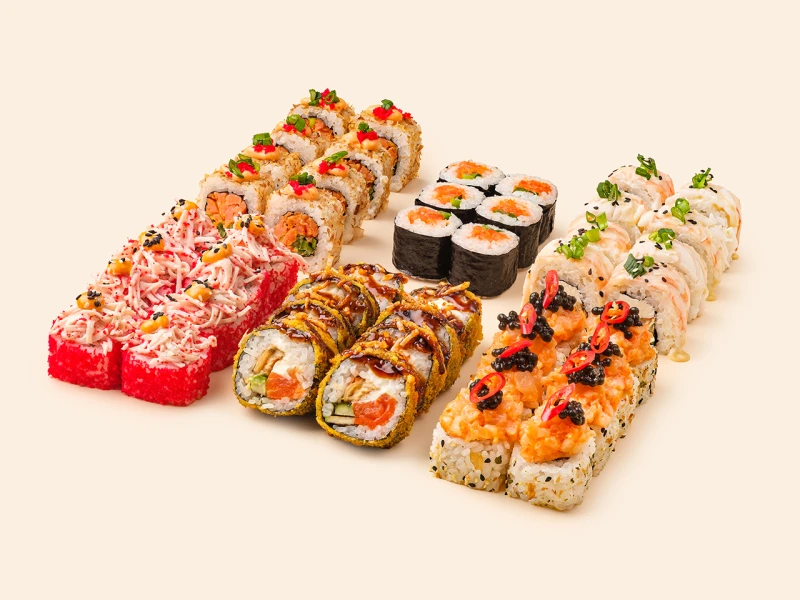 Роллы спайси гребешок (8 шт.), Роллы Филадельфия с креветкой (8 шт.), Запеченная Калифорния (8 шт.), Темпура с угрем и лососем (8 шт.), Роллы Бонито (8 шт.), Маки с лососем (8 шт.)