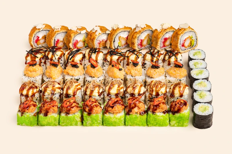 Ролл Спайси гребешок (8 шт.), Ролл Спайси тунец (8 шт.), Маки авокадо (6 шт.), Запеченный лосось Блю чиз (8 шт.), Запеченный угорь (8 шт.), Темпура креветка Том ям (8 шт.)