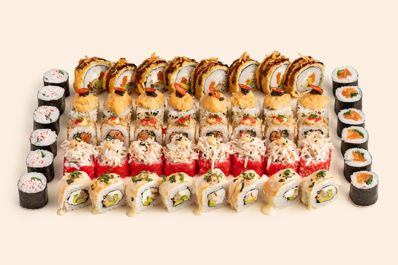 Маки с крабом (6 шт.), Маки с лососем (6 шт.), Темпура с угрем и лососем(8 шт.), Ролл Бонито (8 шт.), Филадельфия с креветкой (8 шт.), Роллы спайси гребешок (8 шт.), Запеченный Калифорния (8 шт.), соевый соус, имбирь, васаби