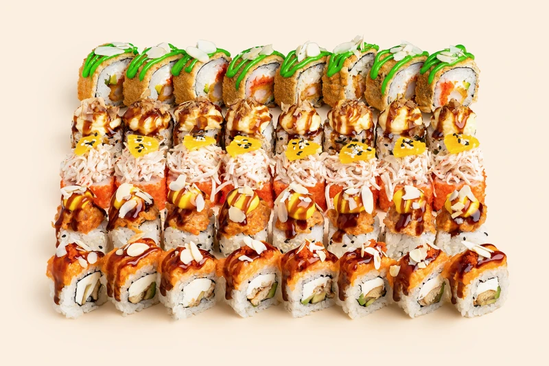 Темпура креветка васаби (8 шт.), Запеченный угорь (8 шт.), Запеченный с тунцом и лососем (8 шт.), Ролл Опаленный лосось спайси (8 шт.), Ролл Калифорния (8 шт.)
