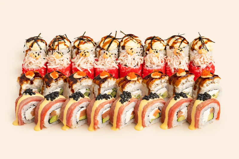 Ролл Дракон (8 шт.), Ролл опаленный тунец (8 шт.), Запеченный Калифорния (8 шт.), Запеченный лосось Блю чиз (8 шт.)