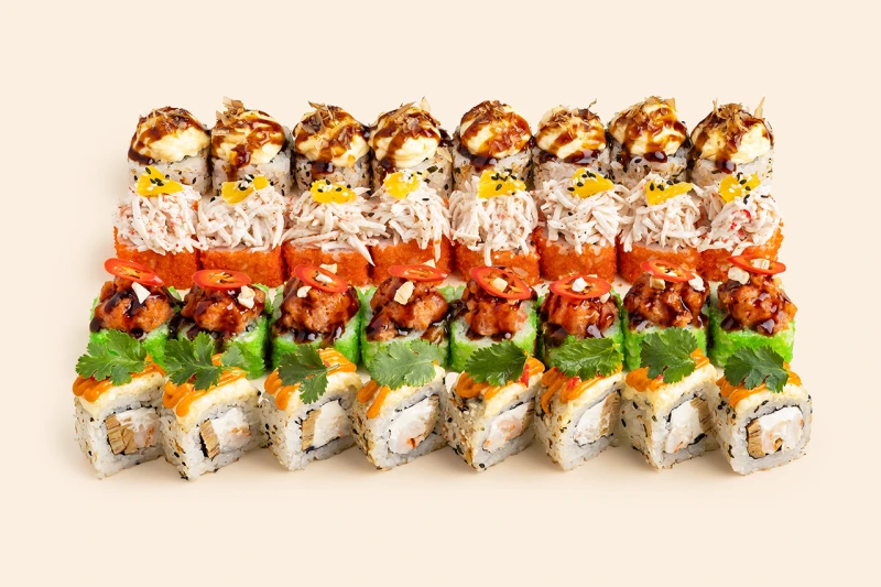 Запеченный угорь (8 шт.), Запеченный креветка Том ям (8 шт.), Ролл Калифорния (8 шт.), Ролл Спайси тунец (8 шт.)