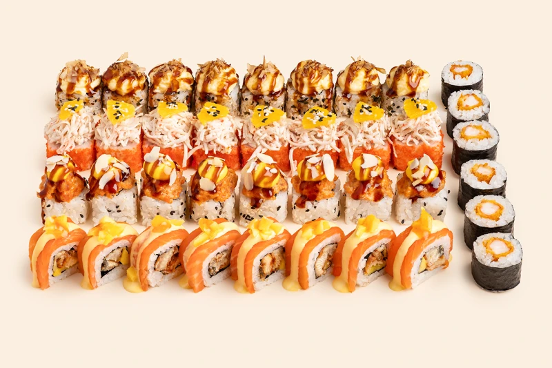 Маки креветка темпура (6 шт.), Запеченный с тунцом и лососем (8 шт.), Запеченный угорь (8 шт.), Ролл Калифорния (8 шт.), Филадельфия манго (8 шт.)