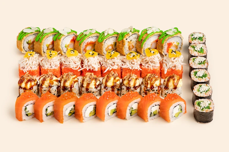 Маки Чука (6 шт.), Темпура креветка васаби (8 шт.), Запеченный угорь (8 шт.), Ролл Калифорния (8 шт.), Филадельфия с икрой (8 шт.)