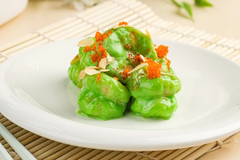 Тигровая креветка, соус Васаби сладкий, крахмал, икра масаго, лепестки миндаля